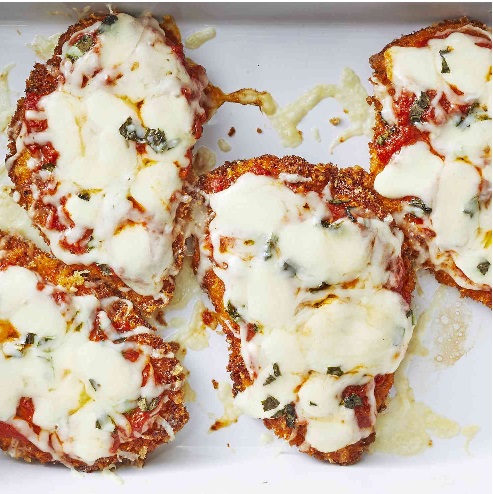 4.Beat eggs in a shallow bowl and set aside. Mix bread crumbs and 1/2 cup Parmesan cheese in a separate bowl, set aside. Dip a flour-coated chicken breast in beaten eggs. Transfer breast to the bread crumb mixture, pressing crumbs into both sides. Repeat for each breast. Let chicken rest for 10 to 15 minutes.
