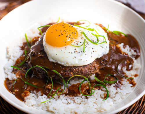 4.Add rice to each plate, top with a burger patty, pour over a generous amount of gravy, top with an egg and garnish with chopped green onions. Enjoy!